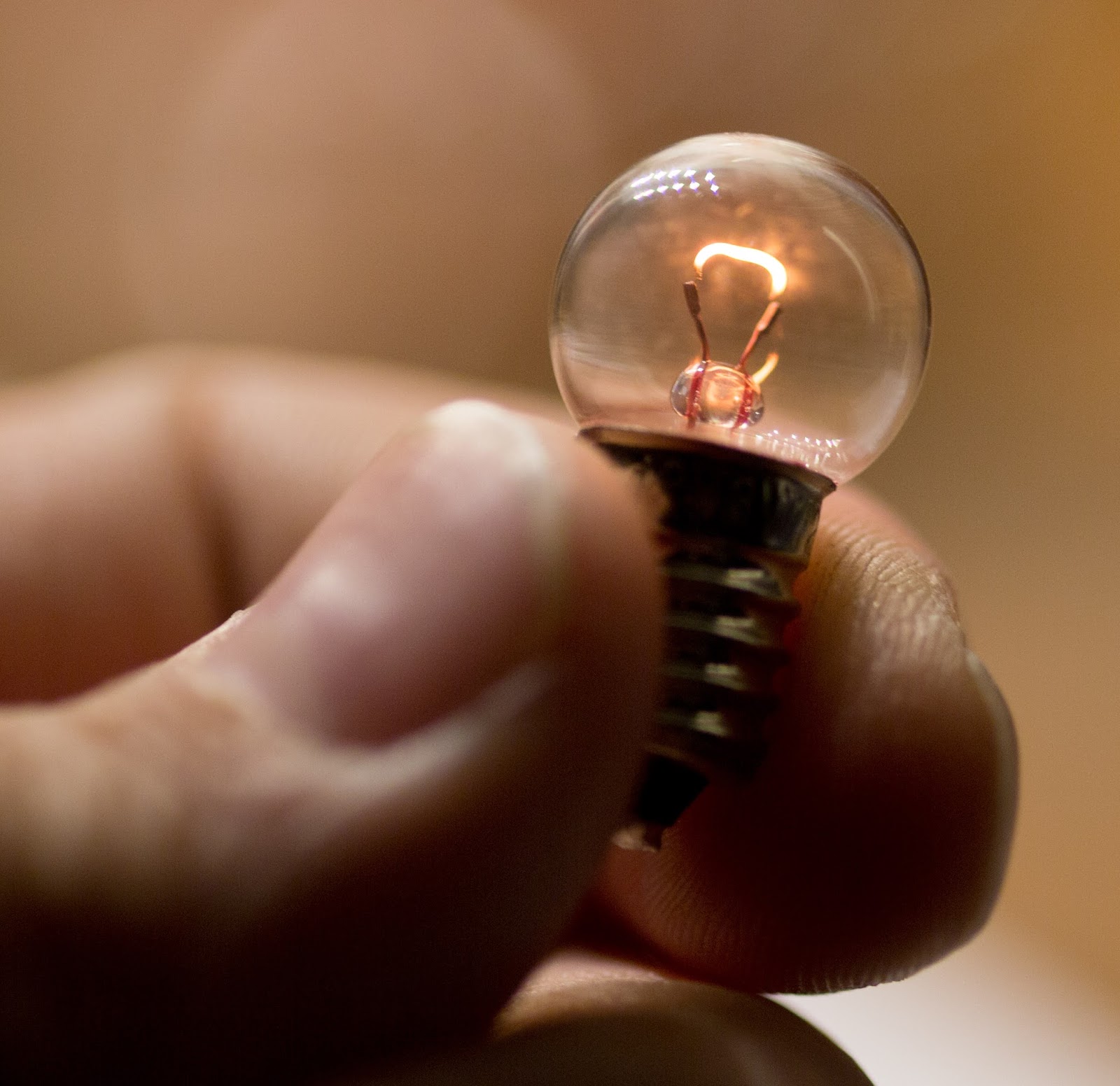 Das ist übrigens eine der fünf Birnchen, die ich für den Frontscheinwerfer im blauen Klapprad bestellt habe. Mit 12V und 3W sind sie bisher die beste Wahl was die Haltbarkeit angeht. Sie sind - das habe ich getestet - kurzeitig in der Lage mit 10W zu leuchten, und sie machen insgesamt ein schön helles Licht mit dem Nabendynamo. Hier auf den Bildern habe ich allerdings eine andere Idee umgesetzt. Ich wollte schon immer mal eine Glühbirne fotografieren, die freigestellt ist und trotzdem leuchtet. Die entstandenen Bilder sind dabei nicht gephotoshoppt oder ähnliches. Es existiert eine Anschlussleitung, bzw es existieren zwei Anschlussleitungen. Aber man sieht sie nicht auf den Bildern. Ich habe hierfür extrem dünnen lackisolierten Draht verwendet, den ich von der Kamera aus gesehen nach hinten geführt habe. Am anderen Ende des Drahtes befindet sich eine 3,7V-Li-Ion-Zelle, die die eigentliche 3W-Birne mit sanften 160mW "befeuert".